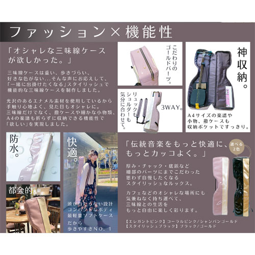 三味線ケースは重い、歩きづらい、 好きな色がない…そんな声をカタチにした「一緒に出掛けたくなる」スタイリッシュで 機能的な三味線ケース。