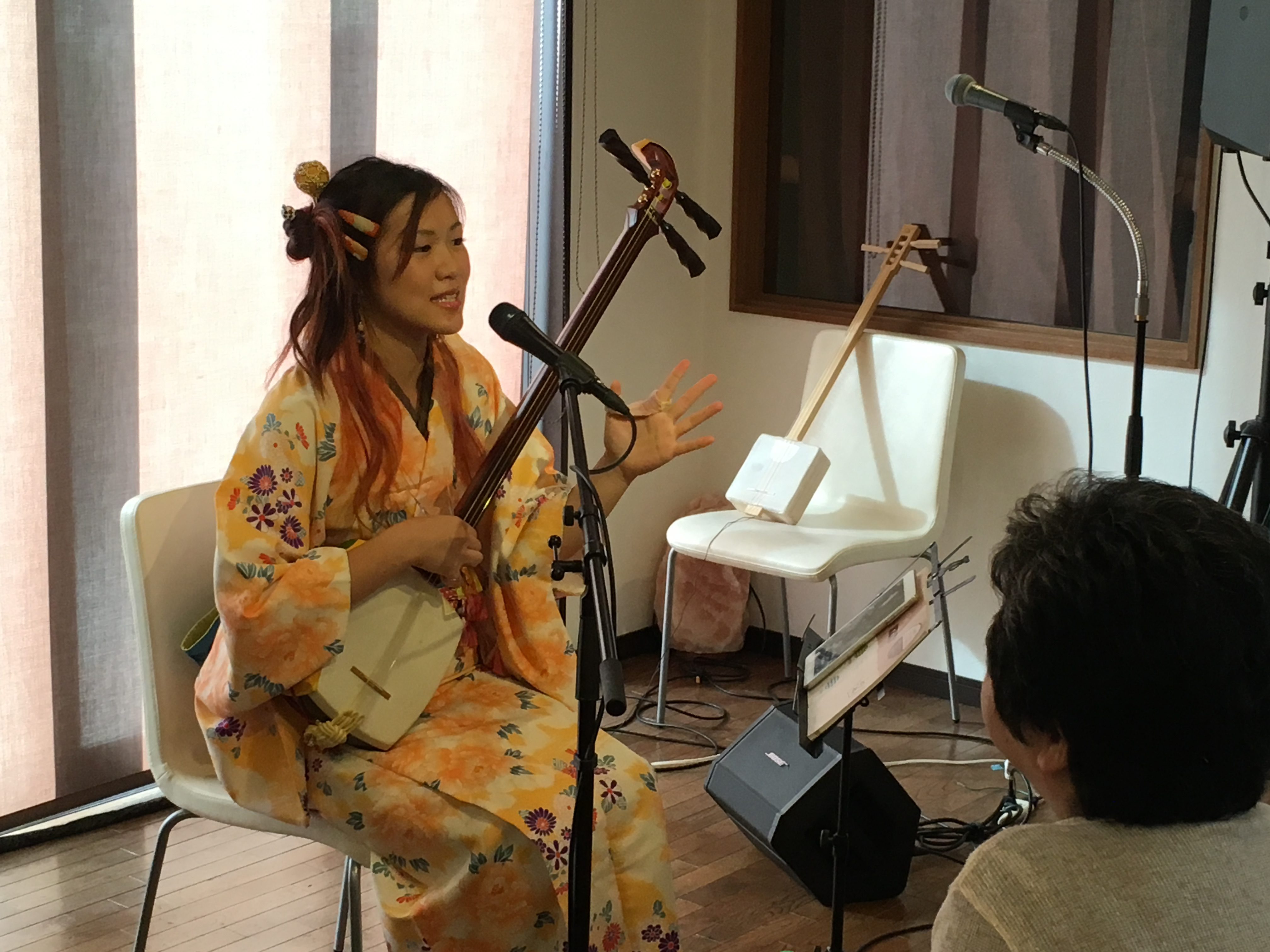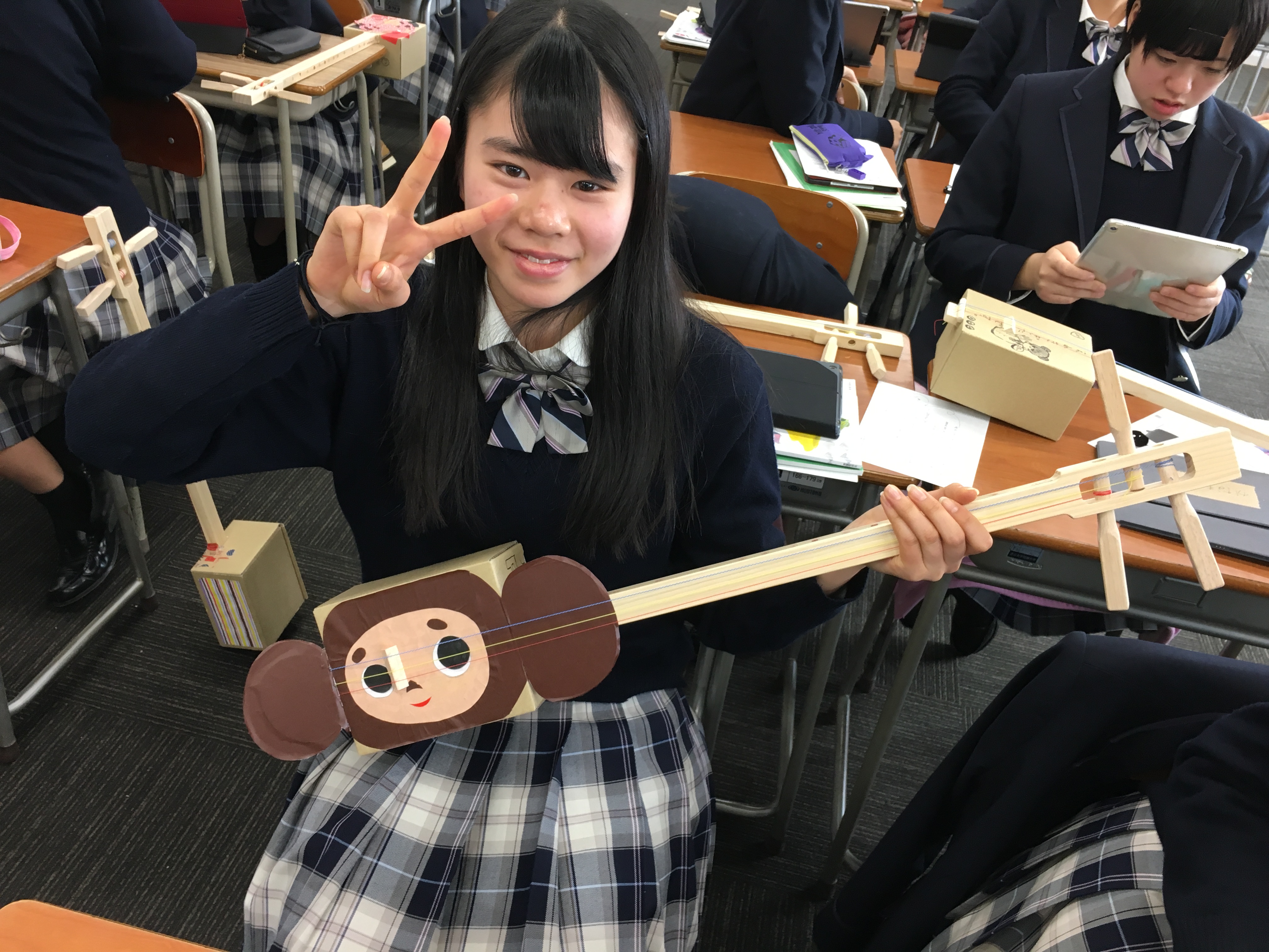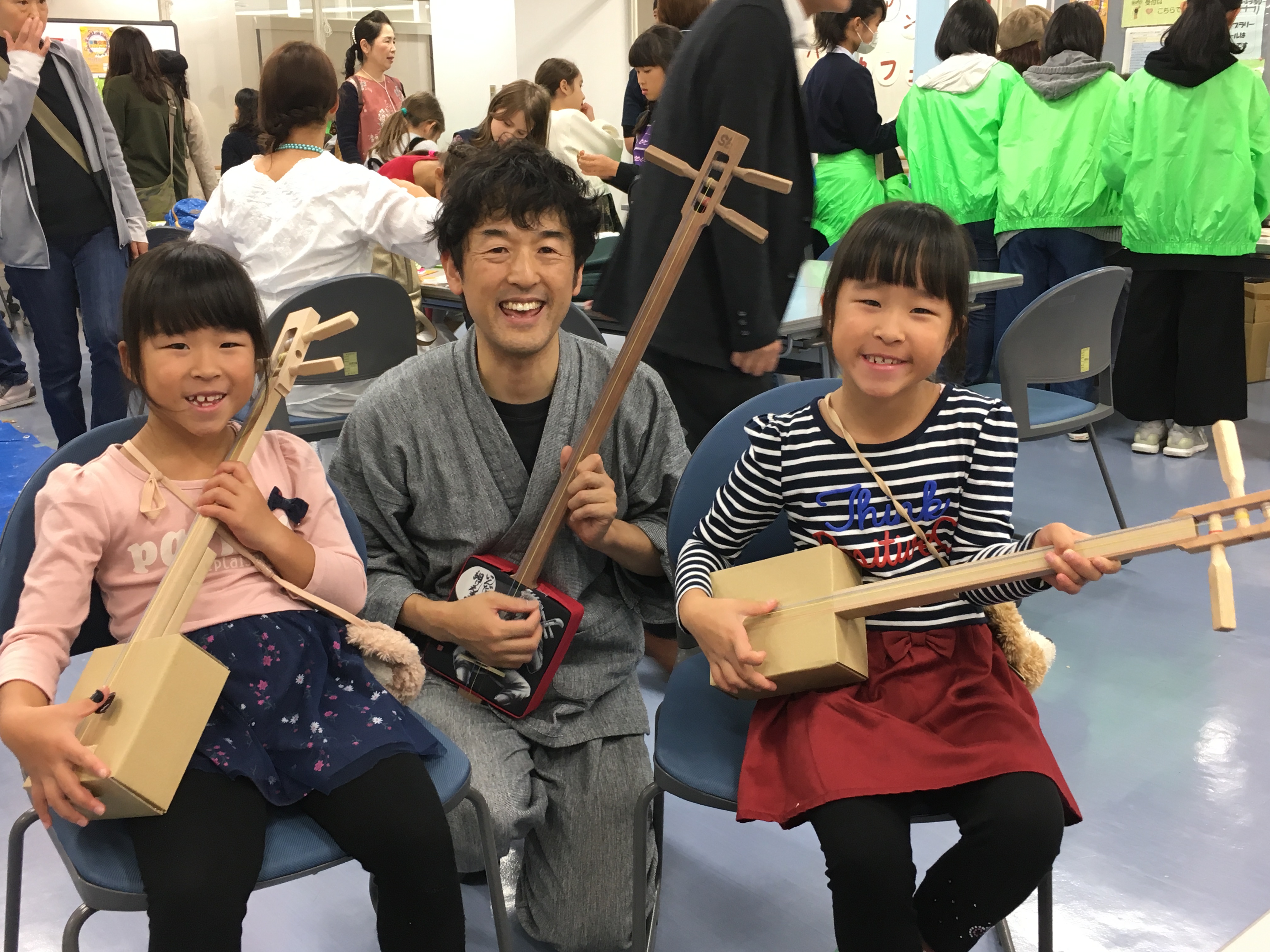 昨年に引き続き実施。音楽を専攻する学生たちが、手づくりした三味線をつかって授業するというユニークな趣向。