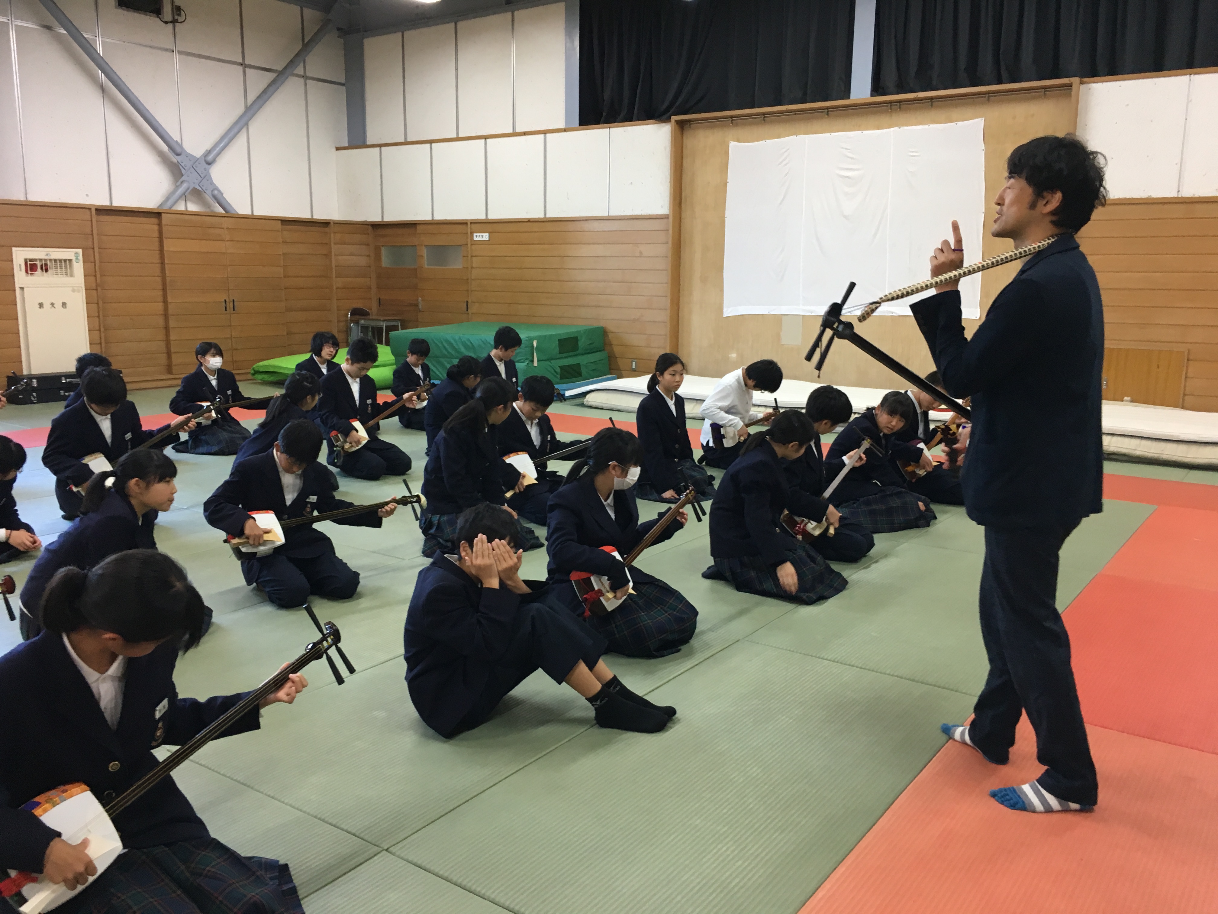 11月〜2月にかけて、富山県内の小中学校の音楽授業で、三味線授業をやらせてもらっています。音楽室で行う場合が多いのですが、富山西部中学では武道館で行いました。たしかに、畳!