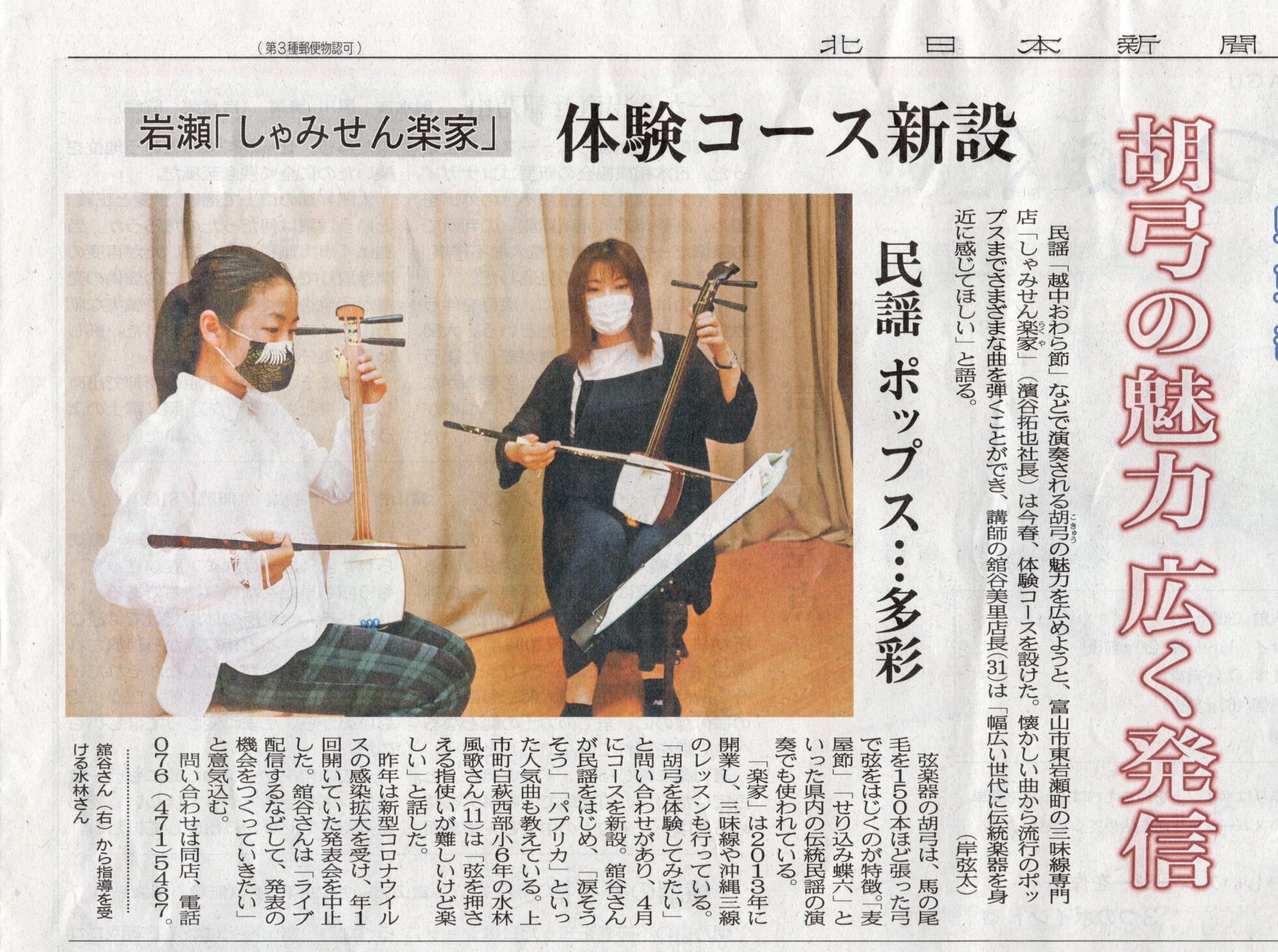 春からはじめた胡弓教室が、今朝の北日本新聞紙面で大きく!紹介いただきました。 記事の大きさだけ、大きな反響が……あるかな? 誰もが知ってるヒットソング集&すぎ胡弓等など、ここにしかないアイテムをそろえてお待ちしております…