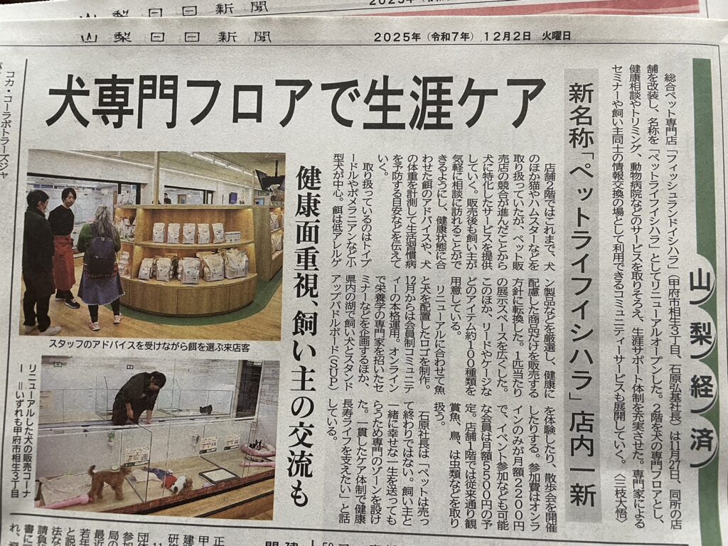 このたび、2025年11月27日にリニューアルオープンした当店の2F ワンちゃん専門フロアについて、山梨日日新聞(12月2日付)およびYBS山梨放送で取り上げていただきました。