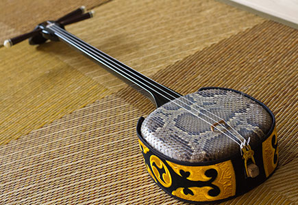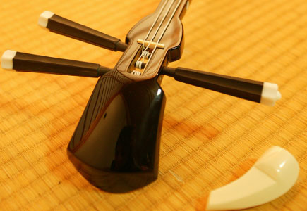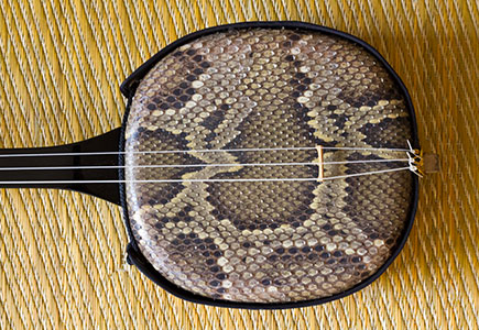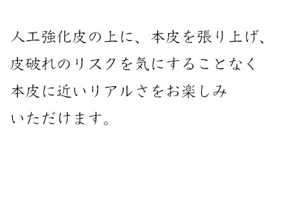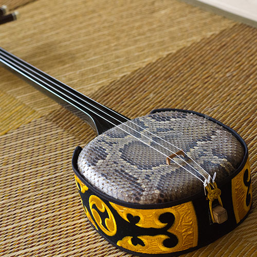 合成皮の上に本皮を張り合わせ、本皮三線そっくりに仕上げた一本。