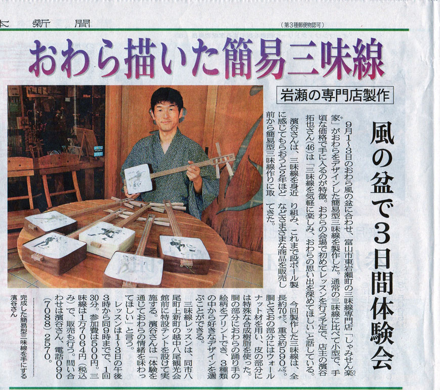 おわら描いた簡易三味線 2017年8月31日 マスコミ掲載 濱谷拓也 風の盆で3日間体験会(2017年8月31日) 9月1日〜3日のおわら風の盆に合わせ、おわらをデザインした簡易三味線を製作。通常の三味線に比べて小型で、手頃な価格で手に入るのが特徴。 Tweet